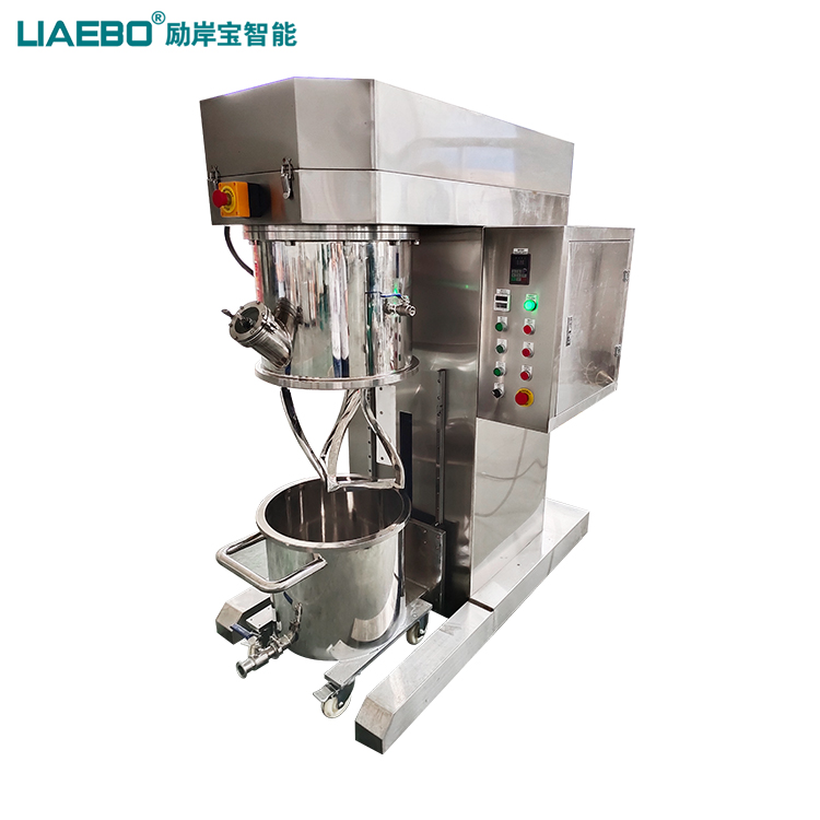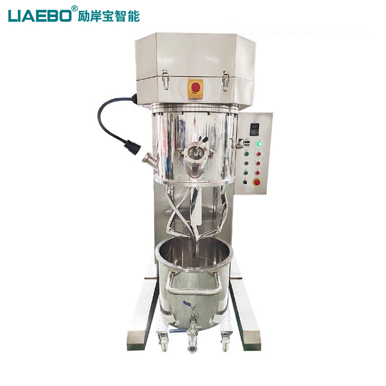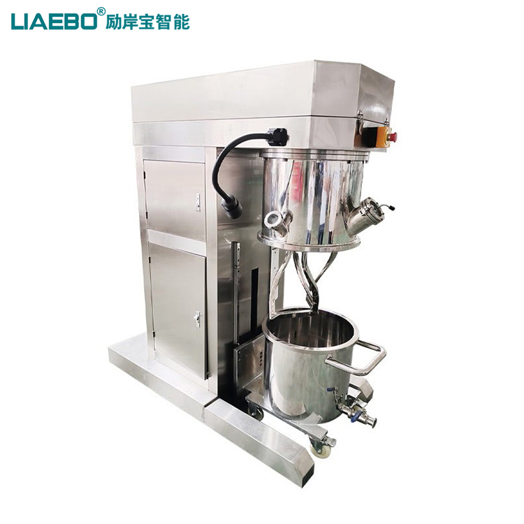 雙行星真空攪拌機是一種高性能、高效率、易清洗維護的新型攪拌設(shè)備。主要由減速電機、行星架、攪拌器、分散器、刮壁器、料桶、升降系統(tǒng)、液壓擠出系統(tǒng)以及機架等構(gòu)成,設(shè)備的雙組攪拌器運行時自轉(zhuǎn)同時繞著軸心進行公轉(zhuǎn),攪拌器形式根據(jù)物料粘度和工藝特性選配,常見的包括漿葉式、麻花式、爪式、框式等,具備良好的混合、反應(yīng)、捏合、溶解的作用;高速分散器由多層具備極高線速度的鋸齒狀分散盤組成,它同樣在高速自轉(zhuǎn)的同時繞著軸心進行公轉(zhuǎn),能夠?qū)⒎哿?助劑)快速的分散到漿料里,具備很強的分散作用。設(shè)備配有一組獨立刮刀,對桶壁進行不斷的刮拭,同時攪拌漿葉可以增加刮片,對料桶底部進行刮拭,避免攪拌死角,確保產(chǎn)品的穩(wěn)定性;雙行星真空攪拌機傳動采用行星齒輪傳動,有較大的輸出扭矩,適用干高溫、高固,高粘度等高難度工況;該設(shè)備采用密閉式設(shè)計,可以配合真空系統(tǒng),實現(xiàn)真空攪拌,攪拌桶也可設(shè)計帶夾套加熱,配合模溫機,實現(xiàn)恒溫攪拌功能,是市場上針對高粘度物料的分散、攪拌設(shè)備。