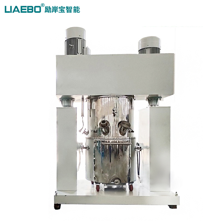 雙行星真空攪拌機是一種高性能、高效率、易清洗維護的新型攪拌設(shè)備。主要由減速電機、行星架、攪拌器、分散器、刮壁器、料桶、升降系統(tǒng)、液壓擠出系統(tǒng)以及機架等構(gòu)成,設(shè)備的雙組攪拌器運行時自轉(zhuǎn)同時繞著軸心進(jìn)行公轉(zhuǎn),攪拌器形式根據(jù)物料粘度和工藝特性選配,常見的包括漿葉式、麻花式、爪式、框式等,具備良好的混合、反應(yīng)、捏合、溶解的作用;高速分散器由多層具備極高線速度的鋸齒狀分散盤組成,它同樣在高速自轉(zhuǎn)的同時繞著軸心進(jìn)行公轉(zhuǎn),能夠?qū)⒎哿?助劑)快速的分散到漿料里,具備很強的分散作用。設(shè)備配有一組獨立刮刀,對桶壁進(jìn)行不斷的刮拭,同時攪拌漿葉可以增加刮片,對料桶底部進(jìn)行刮拭,避免攪拌死角,確保產(chǎn)品的穩(wěn)定性;雙行星真空攪拌機傳動采用行星齒輪傳動,有較大的輸出扭矩,適用干高溫、高固,高粘度等高難度工況;該設(shè)備采用密閉式設(shè)計,可以配合真空系統(tǒng),實現(xiàn)真空攪拌,攪拌桶也可設(shè)計帶夾套加熱,配合模溫機,實現(xiàn)恒溫攪拌功能,是市場上針對高粘度物料的分散、攪拌設(shè)備。