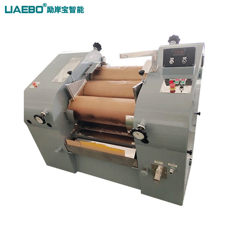 三輥研磨機主要用于各種油漆、油墨、顏料、塑料、食品等膏狀漿料之用,主要為油漆、油墨等高粘度物料的研磨分散之主要設(shè)備。該機通過機器水平方向排列的三根輥筒表面相互擠軋及不同的速度的摩擦而達到研磨作用,研磨物料一般只要研磨二次就可以達到要求,難研物料必須研磨多次,方能達到要求。工作時間快、慢輥調(diào)節(jié)到適當(dāng)位置,啟動機器,然后將需要研磨的漿料加入中輥與慢輥之間銅刀處,漿料經(jīng)過中、慢輥表面擠軋后,由中輥帶給快輥,再由緊貼表面的出料刮刀予以刮下,通過裝有欄板的刀板,流入盛料筒,由此構(gòu)成整個研磨的過程。